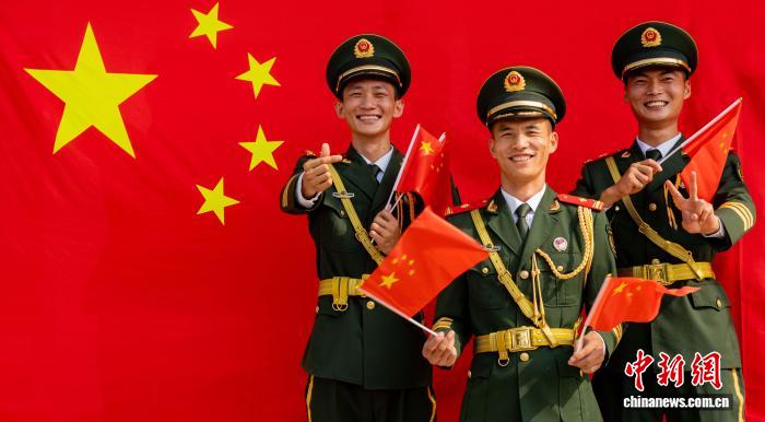 图为武警桂林收队民卒正在艳丽的邦旗旁,将笑颜定格。施朝洲 摄