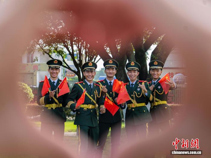 图为武警桂林收队民卒正在艳丽的邦旗旁,将笑颜定格。施朝洲 摄